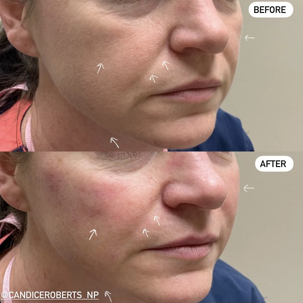 Softening nasolabial folds (parentheses lines around the nose and mouth that worsens with smiling)
